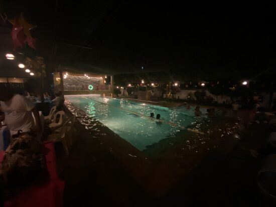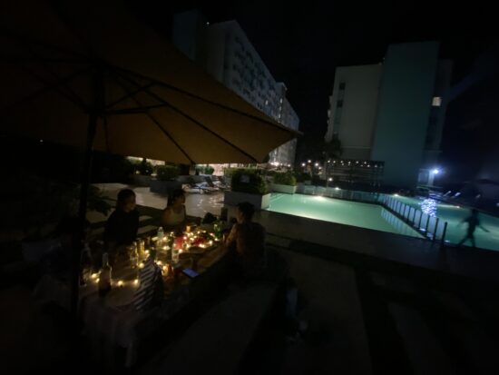 ジムとプールが付いているアパートなので、プールサイドにて外人エキスパッツたちとオーナー、スタッフでプチパーティ。