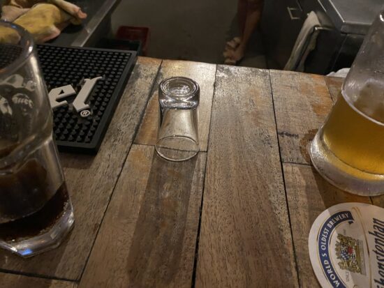 この「ショットグラス逆さ」は「まだ1杯ノルマがあるよ」という印。